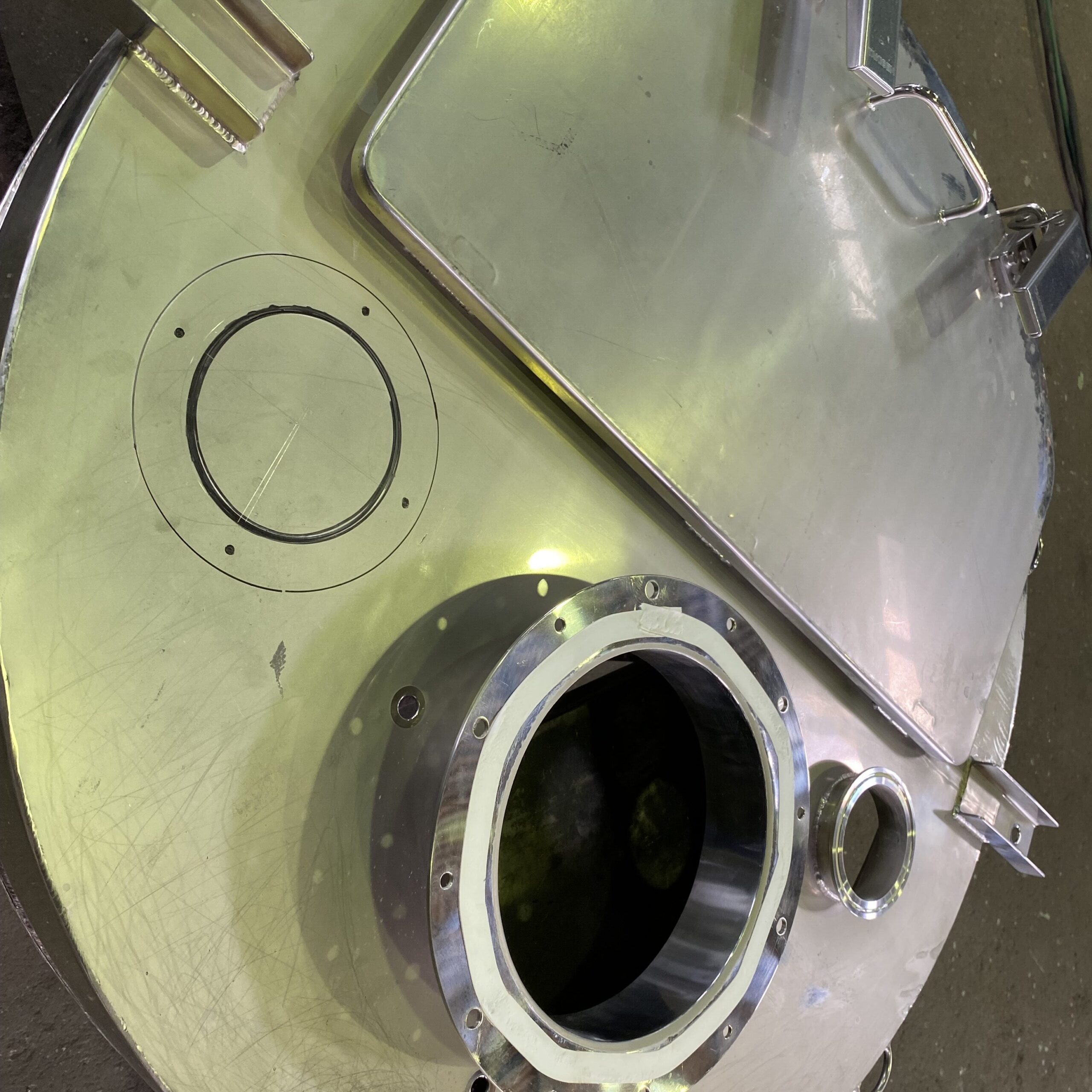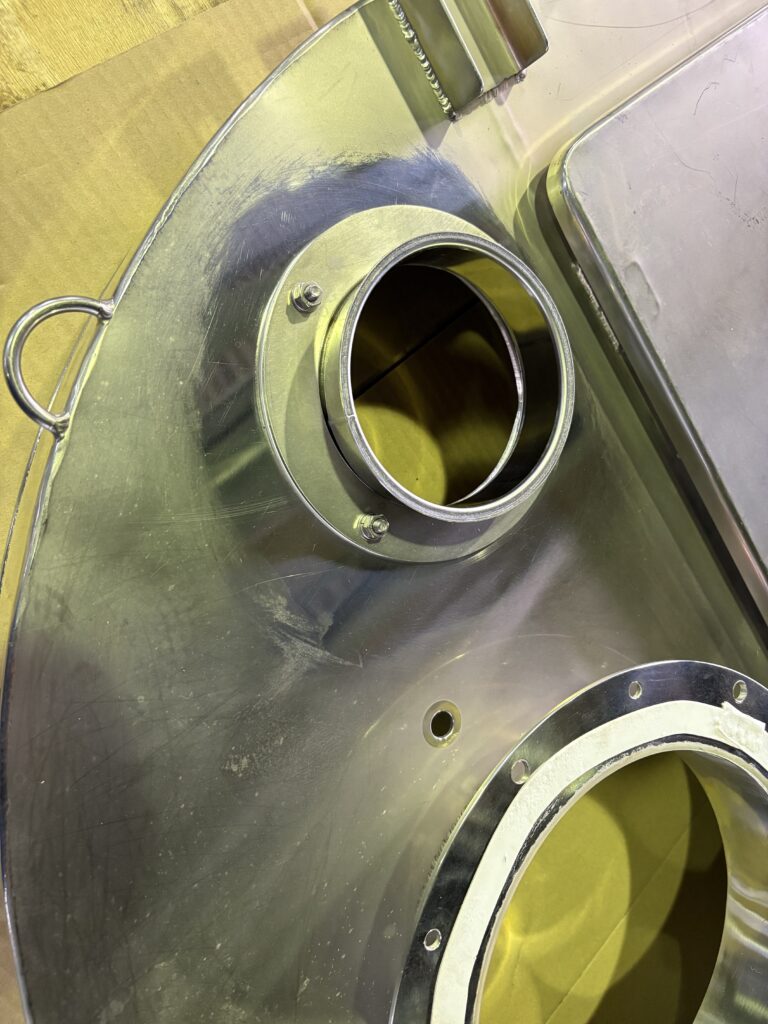 既設機の蓋に穴をあけてフランジを取り付けるという追加工を行いました。上記写真のように穴がない状態の蓋にご依頼の寸法通りに穴をあけ、フランジをボルト止めしました。